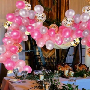 Stor Latex Ballongbåge – Rosa/Lila/Blå/konfetti 4D roseguld med Palmblad 106st