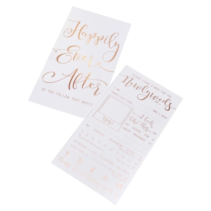 Fina Advice Cards med text i roséguld blir roliga att dela ut till gästerna på bröllopet. Perfekta att lägga ut på borden och blir en rolig aktivitet för gästerna. Korten kommer i en förpackning om 10st och innehåller frågor som exempelvis bostadsort, råd till bröllopsparet mm. Se till att de blir insamlade för ett roligt minne att titta tillbaka på i framtiden.