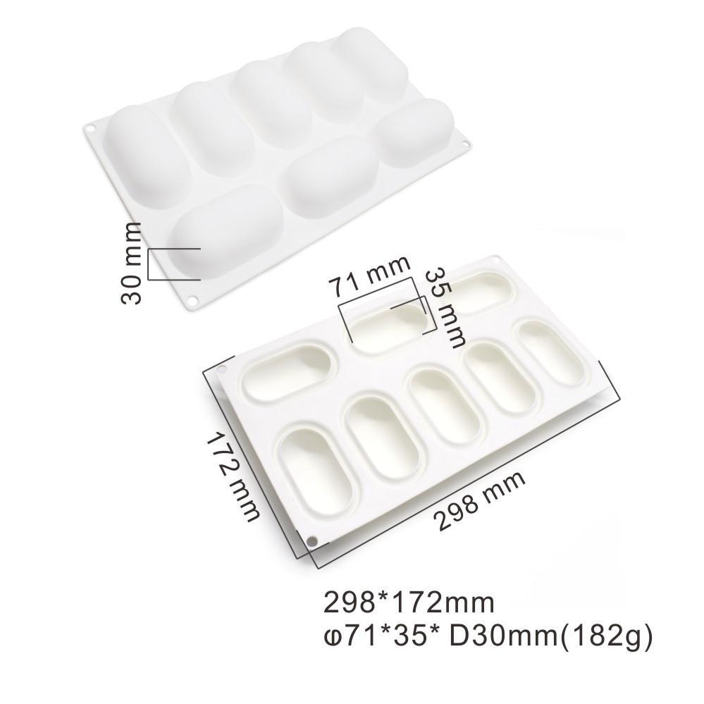 Med denna silikonform kan du göra 8st vackra avlånga portionsbakelser. Gör moussen/smällt chokladen och fyll formen. Låt stelna och tryck sedan ut figurerna. Perfekt som bakform eller för att gjuta exempelvis mousser, pannacottor eller glasskupoler. Formen går att använda både i ugn (max 230 °C) och mikrovågsugn, tål att frysas (lägst -30 °C) och maskindiskas. Den går att använda till t.ex. choklad, mousse, kaksmet, jello, sockerpasta och marsipan.