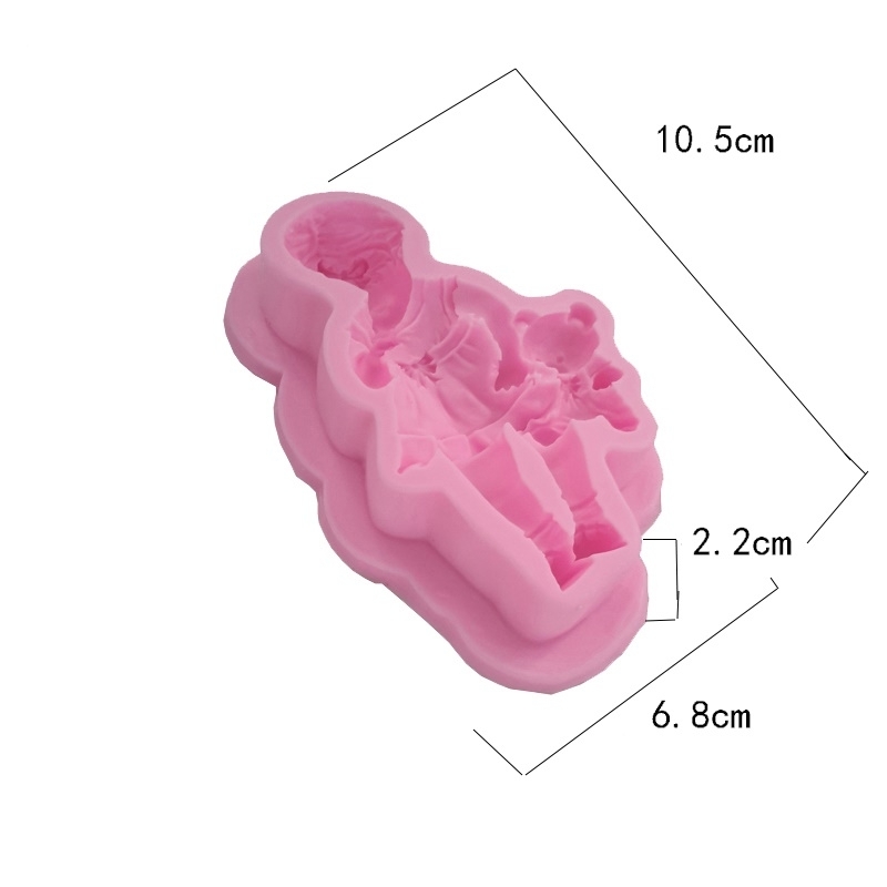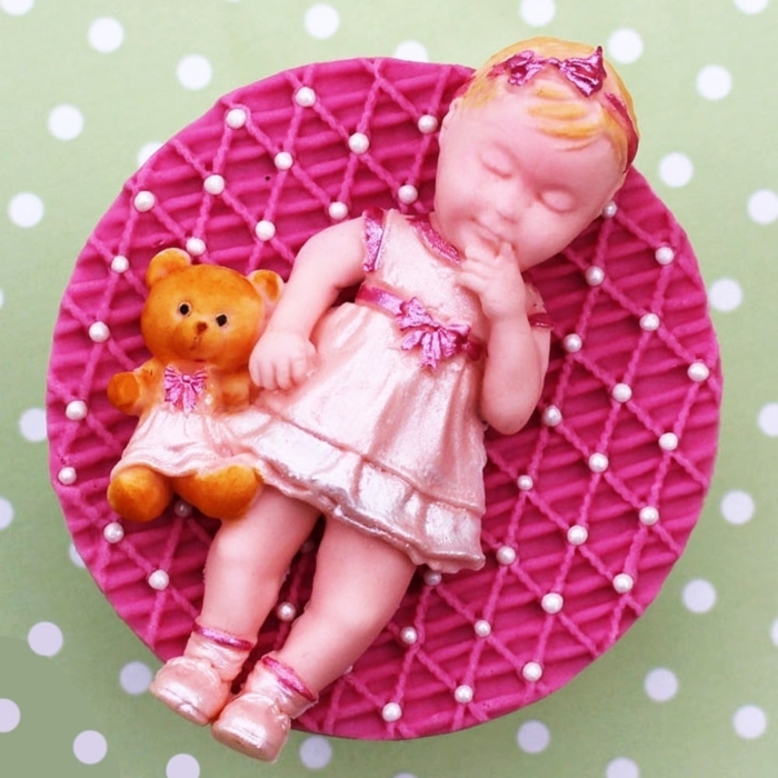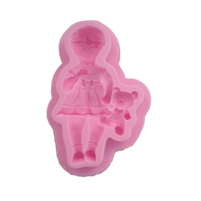 Underbar silikonform för att skapa en bebis flicka med nalle. Väldigt lätt att använda, fyll bara formen och ta bort överflödet. Stoppa in i frysen en liten stund för bästa effekt och sen är det bara att trycka ut innehållet. Måla sedan med pulverfärger för ett verklighetstroget intryck. Perfekt för sugarpaste, marsipan, gumpaste eller choklad.