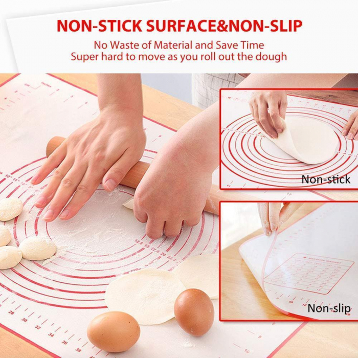 Använd denna universella bakmatta i silikon med non-stick lager som ett underlägg när du knådar deg, gör figurer i sockerpasta eller marsipan eller kavlar tårtlock till exempel. Bakmattan har en måttskala i både cm och inches samt runda mått i mitten vilket gör det superlätt för dig att till exempel kavla tårtlock eller deg till jämna kakor eller piroger. Bakmattan tål både frysas och höga temperaturer och kan alltså användas som underlägg i ugn.