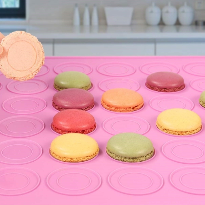 Väldigt praktisk silikonmatta till 48st macaron halvor. Nu blir det lätt att göra dem lika stora och perfekt runda. Spritsas direkt på ringarna som gör så att smeten inte flyter ut. Smörj mattan med lite neutral olja innan användning och låt kakorna vila i 15 minuter innan de tas bort från mattan efter bakning.