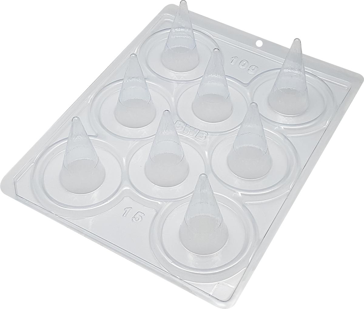 Med denna BWB 3-part Special Mold kan du skapa professionella praliner i form av strutar. Skapa vackra praliner med minimal ansträngning och lite städning. Fyll bara på botten av PET-formen med choklad till den markerade fyllningslinjen, placera den flexibla silikoninsatsen ovanpå chokladen och tryck ner den över PET-biten och låt sedan stelna. Tryck sedan ut chokladen. Tack vare denna fyllningslinje och silikoninsats får du jämn tjocklek och rena kanter och därmed felfria resultat varje gång!