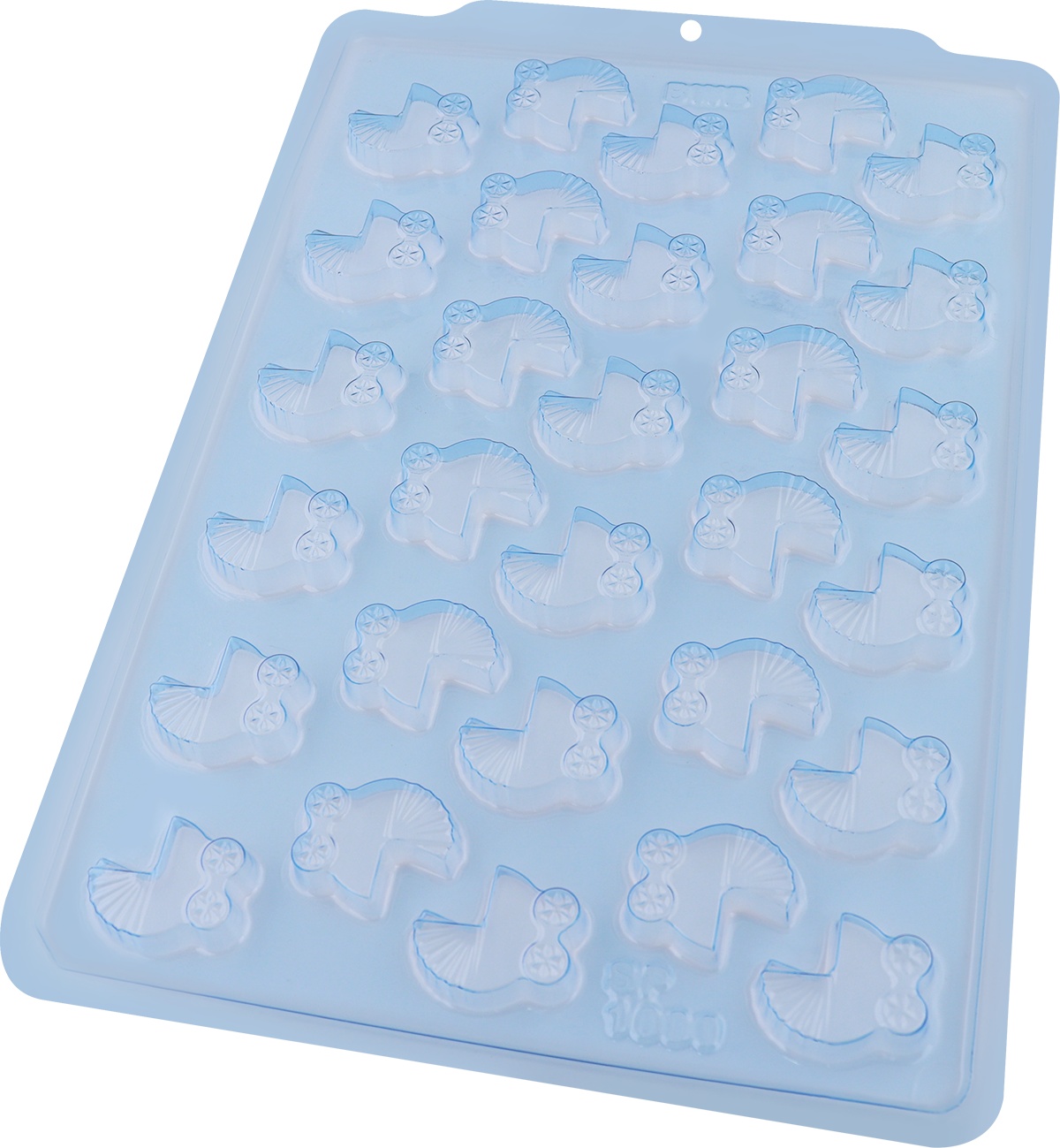Med denna BWB Simple Mold kan du skapa professionella praliner i form av barnvagnar. Fyll bara på botten av PET-formen med choklad upp till kanten. Låt stelna och tryck sedan ut chokladen.