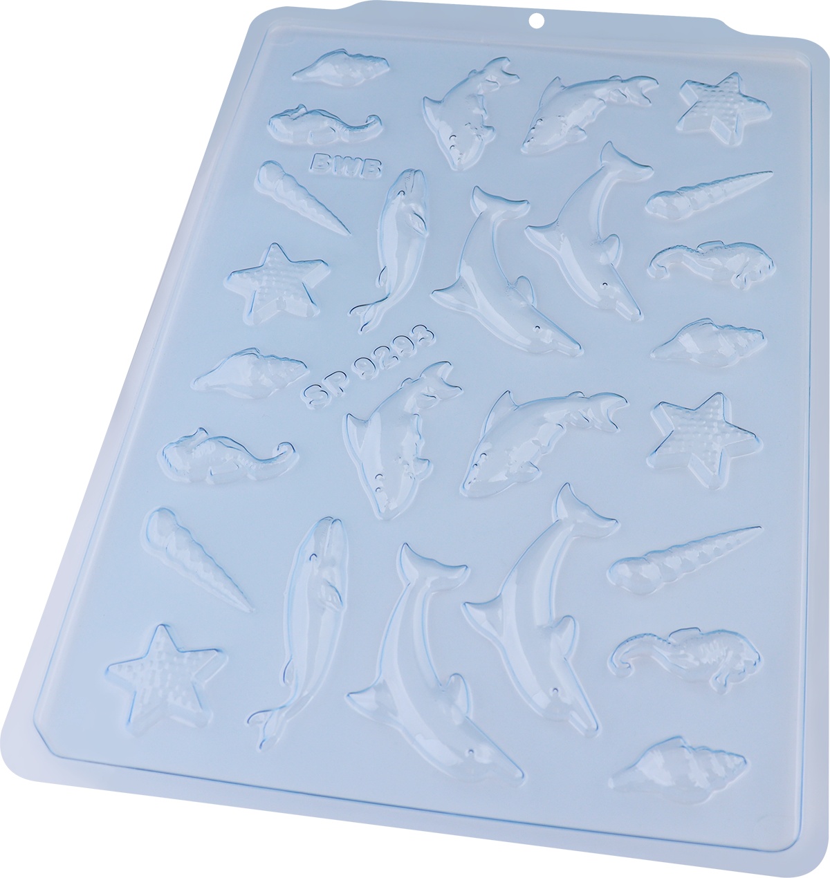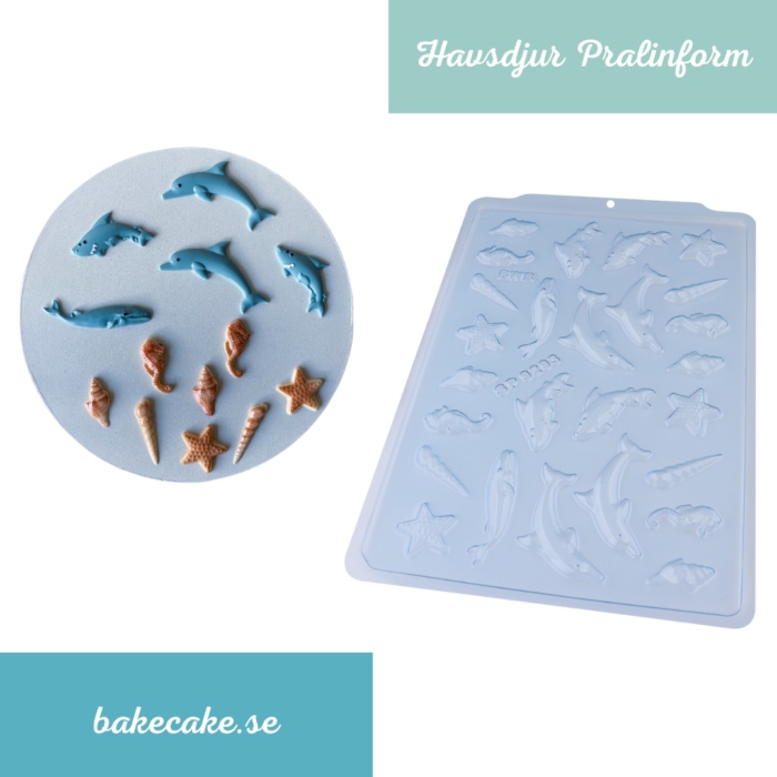 Med denna BWB Simple Mold kan du skapa professionella praliner i form av havsdjur Fyll botten av PET-formen med choklad upp till kanten. Låt stelna och tryck sedan ut chokladen.