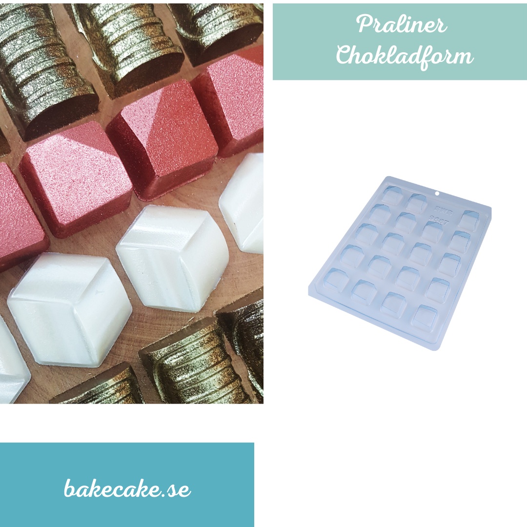 Dessa formar är tillverkade av den brasilianska tillverkaren BWB. BWB hade en genial idé om att förenkla pralintillverkningen och kom fram till uppfinningen med ”BWB 3 Part Molds”. Med en så kallad 3 Part Mold kan du skapa perfekta pralinskal, chokladkoppar och många andra mönster med lätthet och perfektion – utan att slösa på värdefull smält choklad. Med hjälp av markerade fyllningslinjer på formarna, samt med insatser som används för att skapa själva formen på skalet, kan du säga ”adjö” till att vända och vrida på chokladformen för att täcka väggarna med choklad. Spana in 3 Part Molds här.