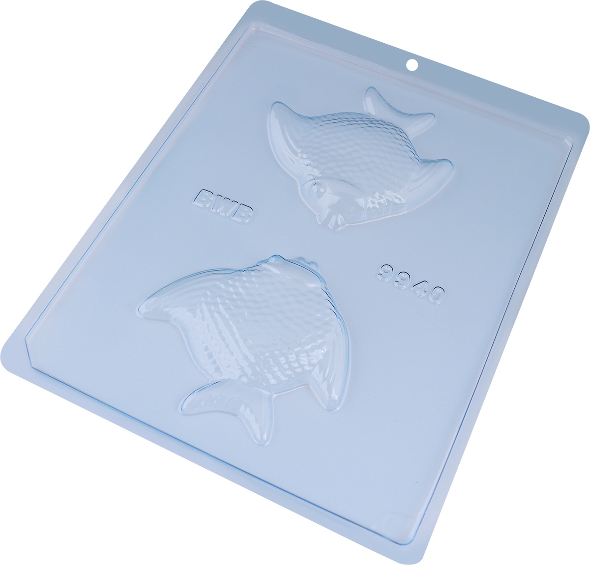 Med denna BWB Simple Mold kan du skapa professionella praliner i form av 2st fiskar. Fyll bara på botten av PET-formen med choklad upp till kanten. Låt stelna och tryck sedan ut chokladen.