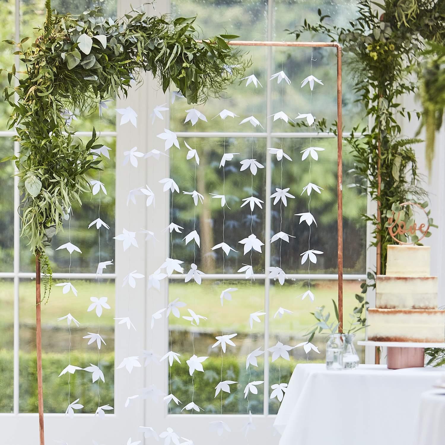 Vackert draperi av vita blommor till bröllopet. Detta backdrop är 1,8m långt och kan hängas upp bakom honnörsbordet eller på väggen till fotobåset för en fängslande effekt.