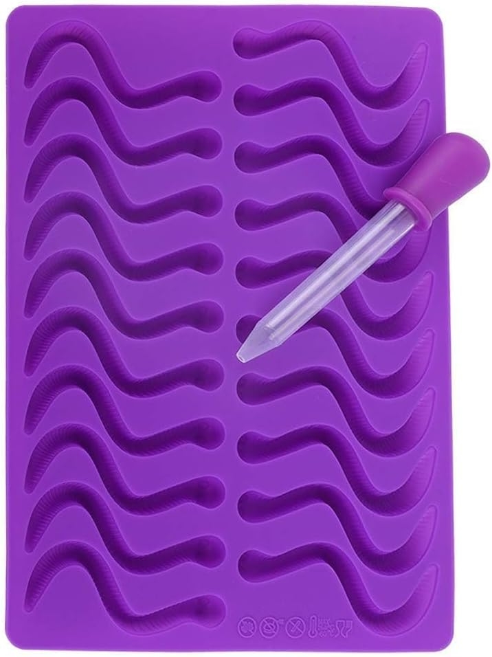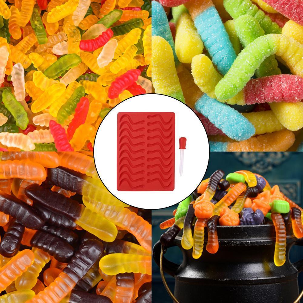 Fin silikonform med pipett för att göra godisormar eller godismaskar. Pipetten gör det lätt och smidigt att fylla formen. Klassisk modell för att göra egna gummimaskar.