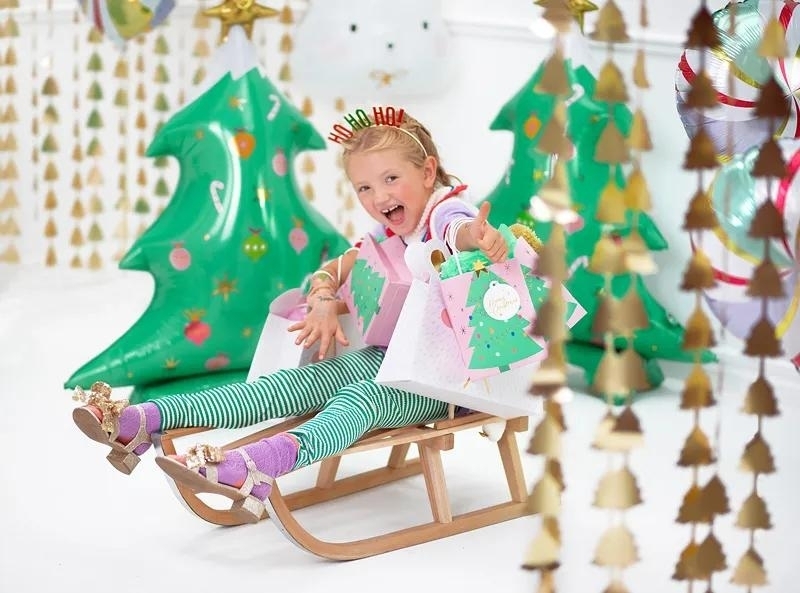 Presentpåse julgran i ljusrosa med färgglatt och guldmetalliserat tryck.