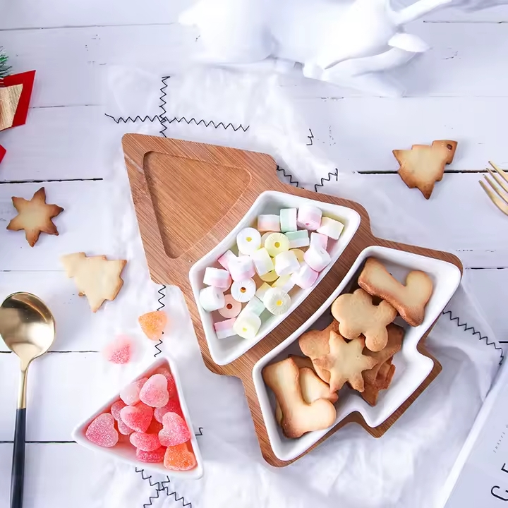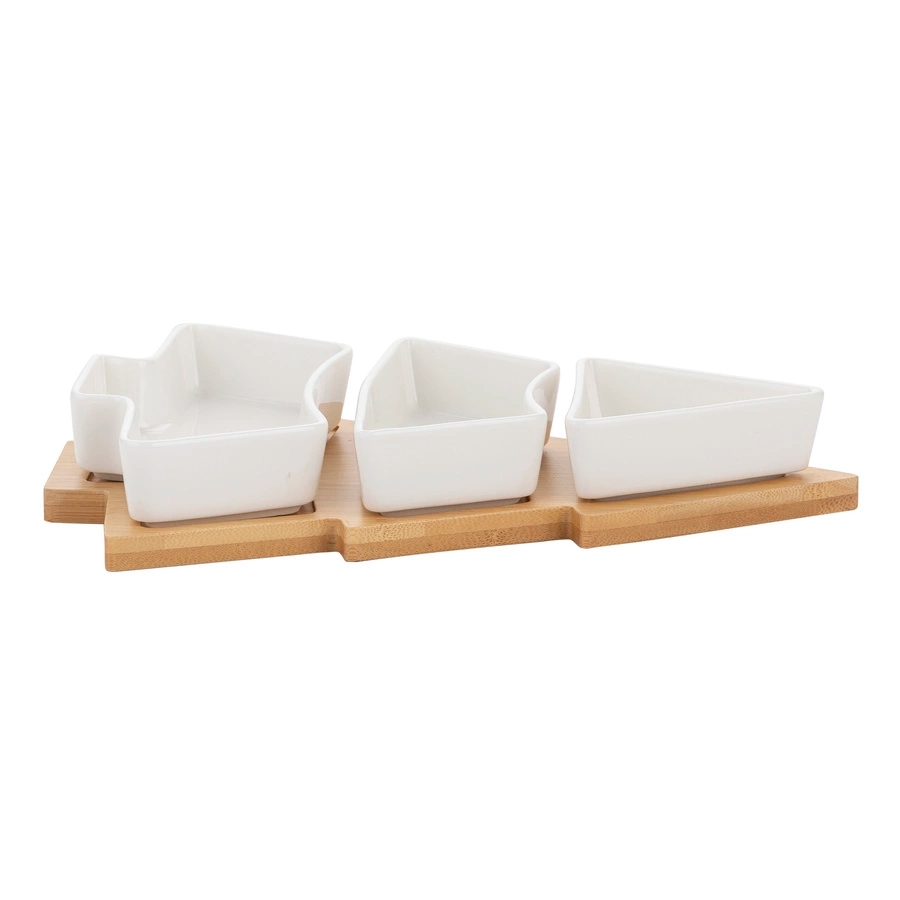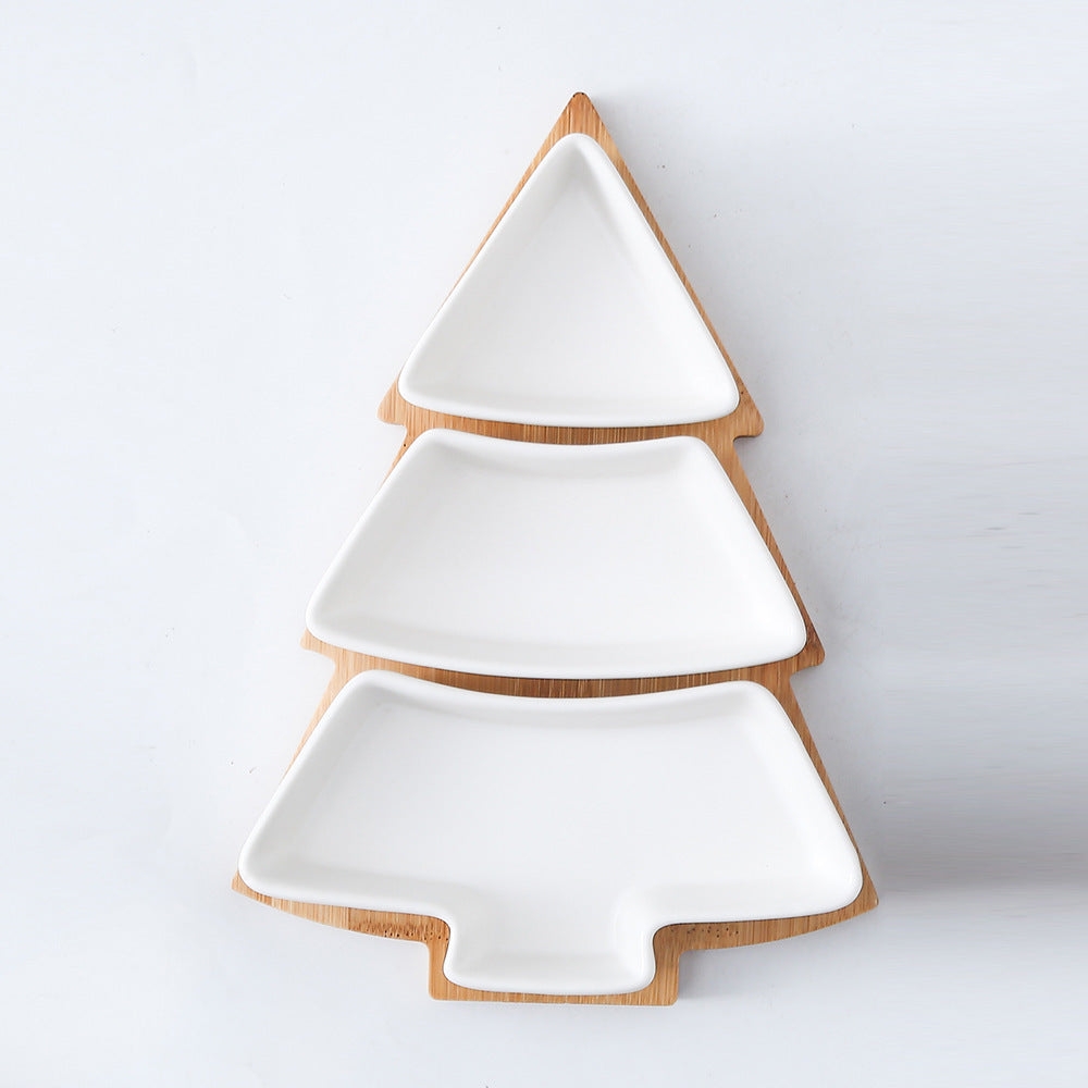 Setet består av tre vita keramikfat formade som granar och en stadig träsockel som håller dem på plats.