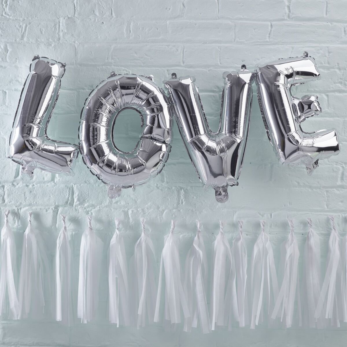 Härlig ballonggirlang i silver som bildar ordet LOVE.