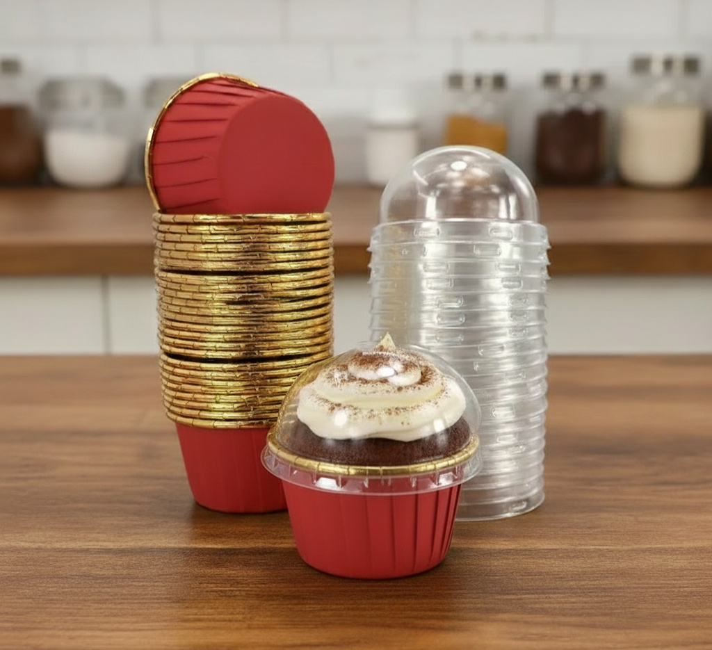Ge dina bakverk en elegant touch med dessa cupcakeformar i röd och guld med tillhörande plastlock. Perfekta för muffins, cupcakes, desserter och småportioner av bakverk – både för fest, catering och hembak. De är tillverkade av högkvalitativ aluminiumfolie som är värmetålig, hållbar och leder värme jämnt för perfekt gräddade bakverk. De medföljande transparenta plastlocken gör formarna enkla att transportera och förvara utan att skada glasyren.