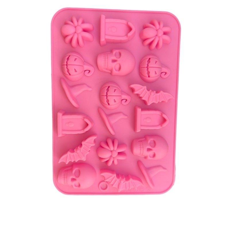 Skapa läskiga och roliga godsaker med denna rosa silikonform fylld med Halloweenmotiv – döskallar, fladdermöss, pumpor och spindlar. Perfekt för godis, choklad, gelé eller isbitar, och lika bra för bakning som för pyssel med barn.