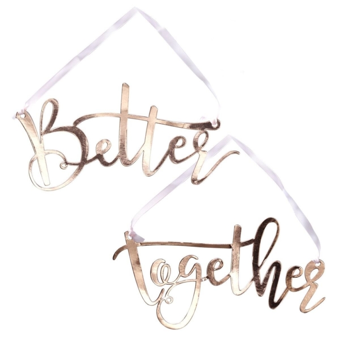 2-pack dekorativa ord i roséguld att hänga på stolsryggarna vid honnörsbordet. Skyltarna är var och en ca 30×17 cm.
